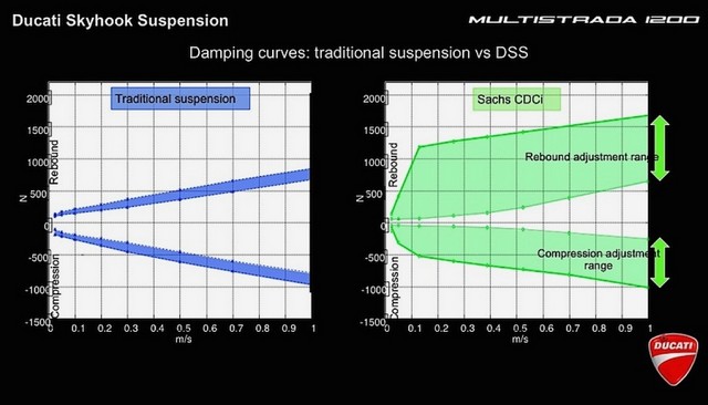 Επειδή ακριβώς οι αποσβέσεις ελέγχονται ηλεκτρονικά, το εύρος των ρυθμίσεων είναι πολύ-πολύ μεγαλύτερο από ό,τι με ένα συμβατικό αμορτισέρ --ακόμη και από το προηγούμενο σύστημα παθητικής ανάρτησης της Ducati, το DES. Στο σχετικό διάγραμμα με τους δύο πίνακες (Ducati Skyhook Suspension), βλέπουμε πόσο μεγαλύτερο είναι το εύρος ρυθμίσεων της ενεργητικής ανάρτησης Skyhook (πράσινη επιφάνεια, δεξιά) από μίας συμβατικής.