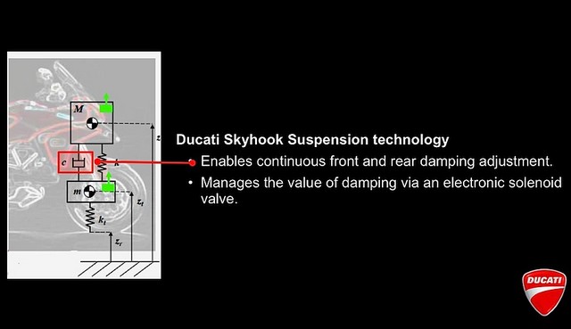 Με την ονομασία Skyhook η Ducati παρουσιάζει το πρώτο -μαζί με το ανάλογο του BMW HP4- ημιενεργητικό σύστημα ηλεκτρονικά ρυθμιζόμενης ανάρτησης σε μοτοσυκλέτα παραγωγής. Το χαρακτηρίζουμε ημί-ενεργητικό διότι αποφασίζει αυτόνομα για τη βέλτιστη απόσβεση των αναρτήσεων (εμπρός και πίσω) ανάλογα με τις εκάστοτε συνθήκες οδήγησης και την κατάσταση του δρόμου.