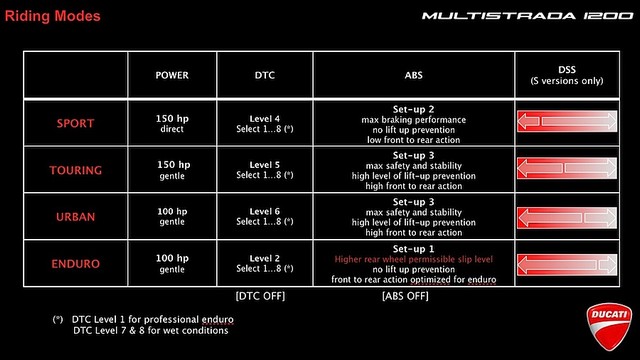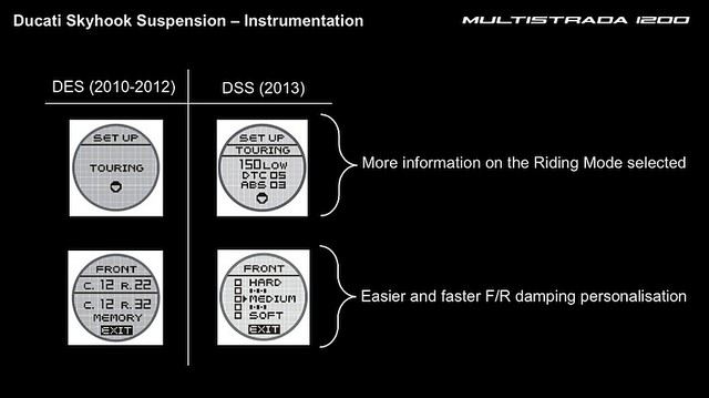 Τις ρυθμίσεις αυτές μπορεί να δει ο αναβάτης μέσω της οθόνης Instrumentation (βλ. σχετική εικόνα). Επιπλέον όμως μπορεί και να τις αλλάξει, επιβάλλοντας τις προσωπικές του προτιμήσεις, τόσο στις αποσβέσεις (συμπίεση «C» και επαναφορά «R») όσο και στη σχέση της μπροστινής προς την πίσω ανάρτηση.